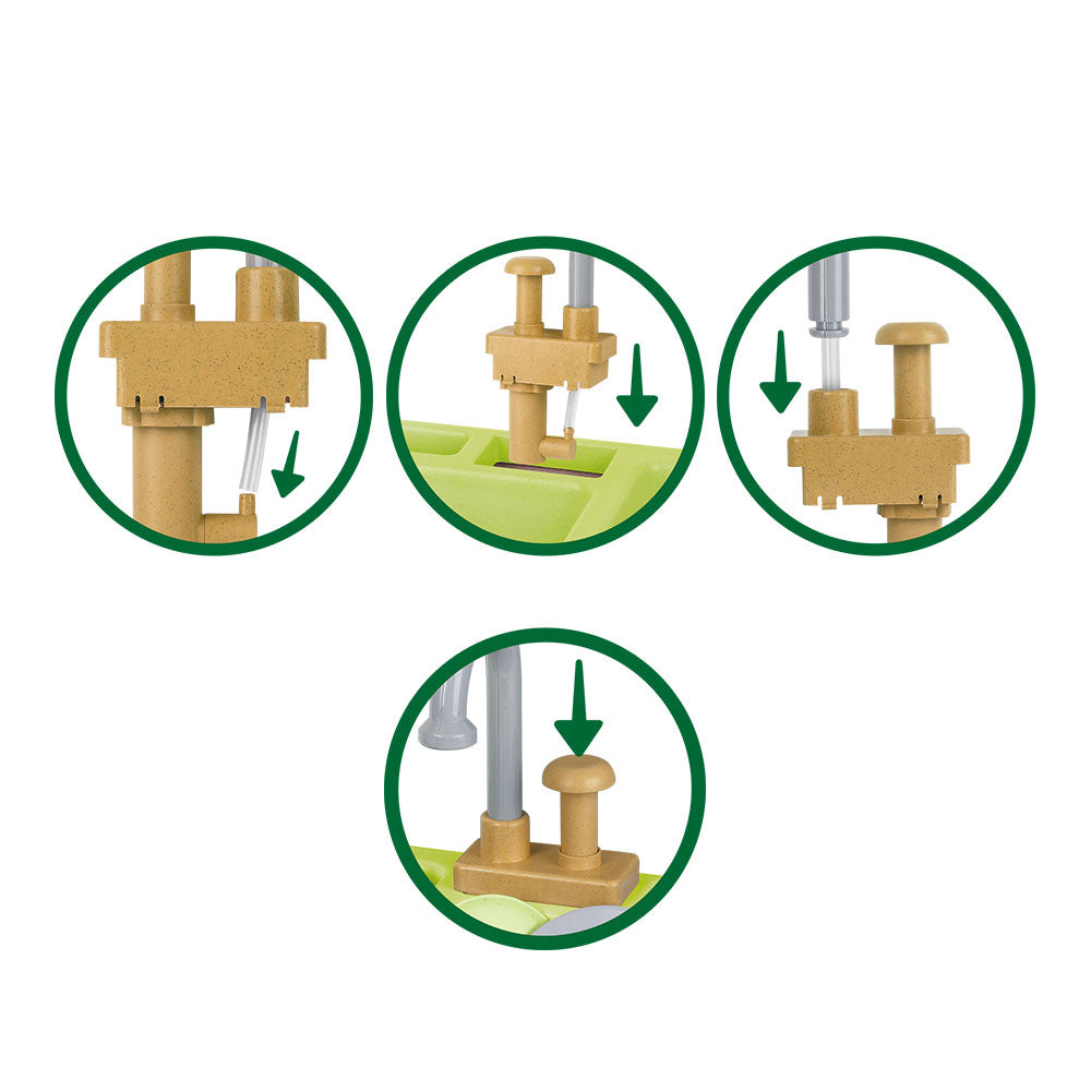 Brinquedo divertido composto por um conjunto diversificado de peças que permitem à criança uma interação lúdica com a tarefa de imitação de uma cena de cozinha e lava-loiça