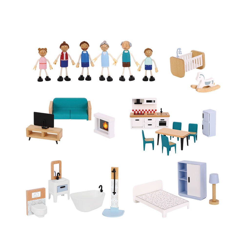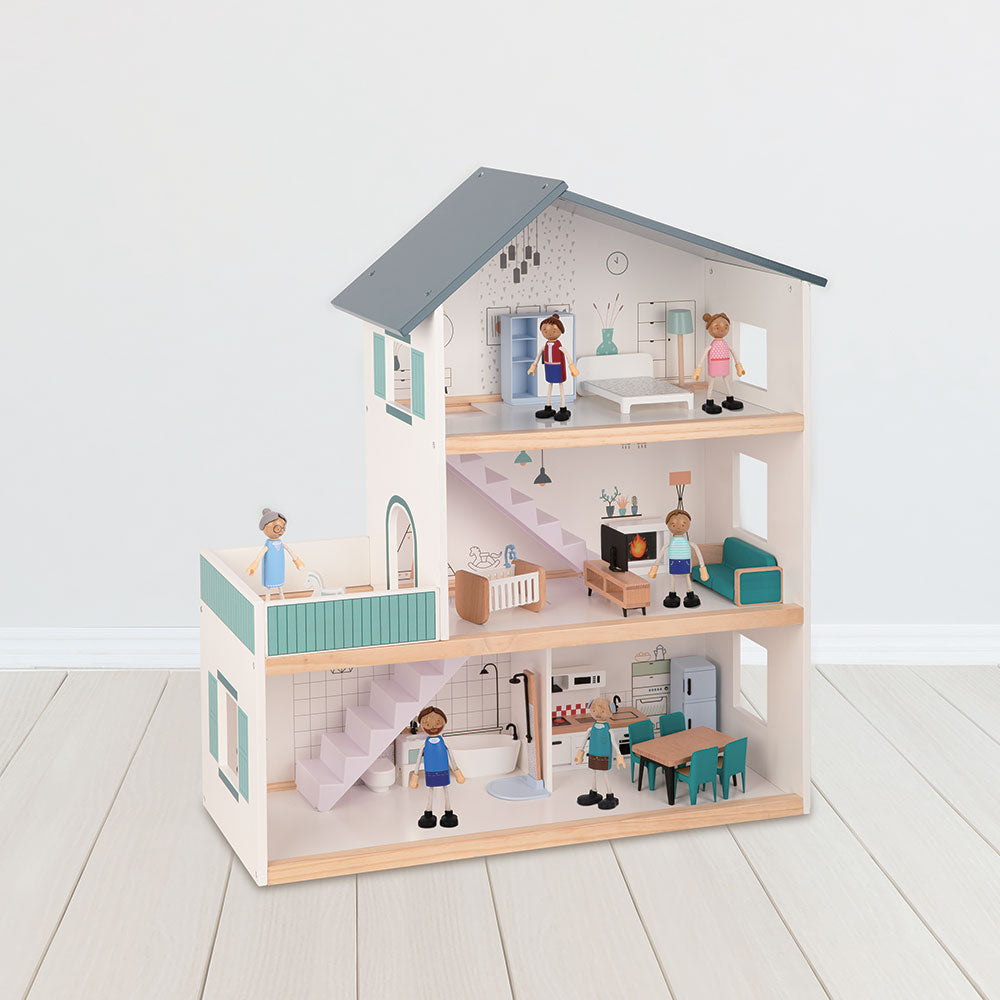 Casa Grande de Bonecas em madeira com 31 peças. Bonecos familiares, mobiliário e acessórios para poderes brincar em conjunto com outra criança. Brincar em conjunto estimula a concentração, potenciando vivências reais de amizade e de ligação emocional a momentos imaginados, sem recurso a meios digitais.
