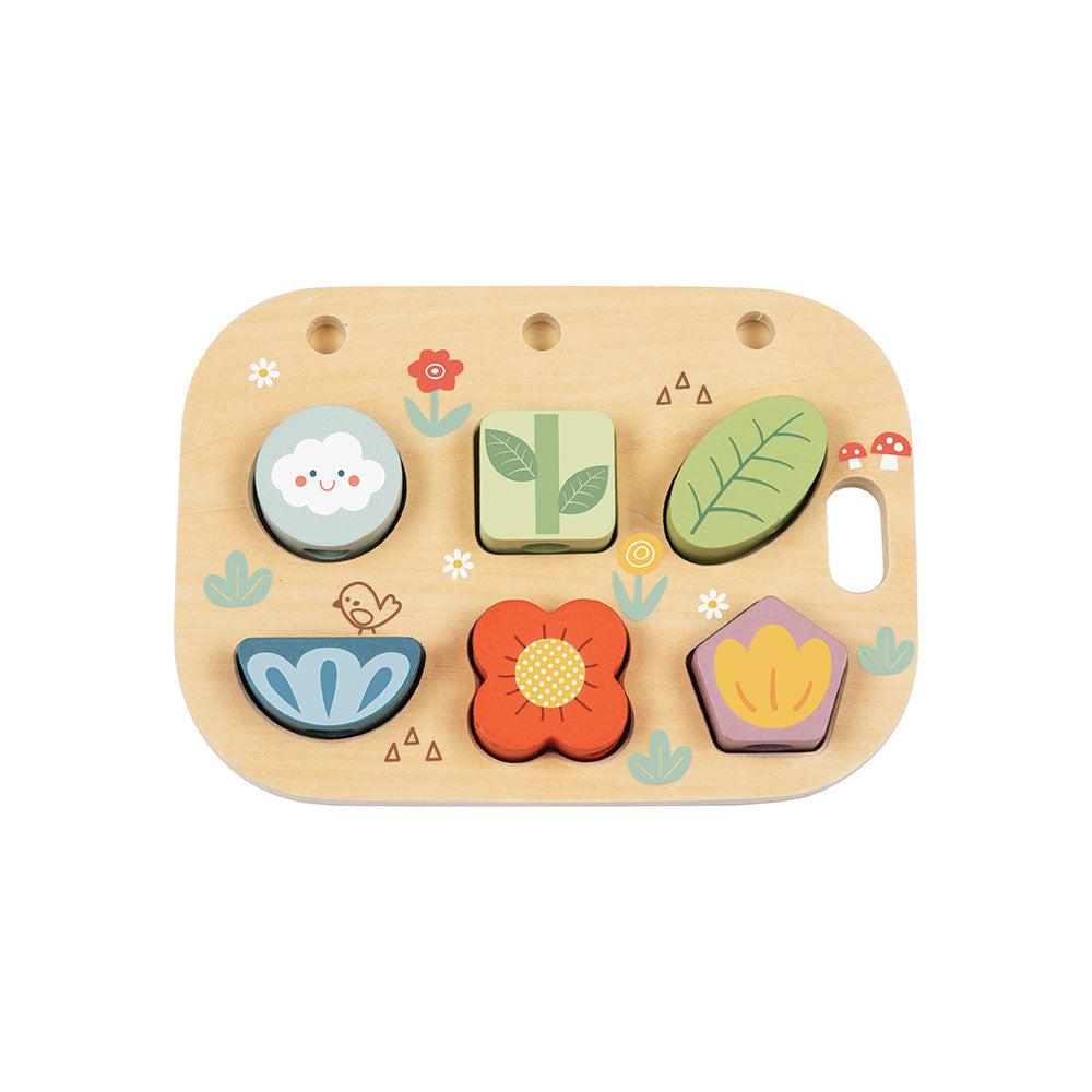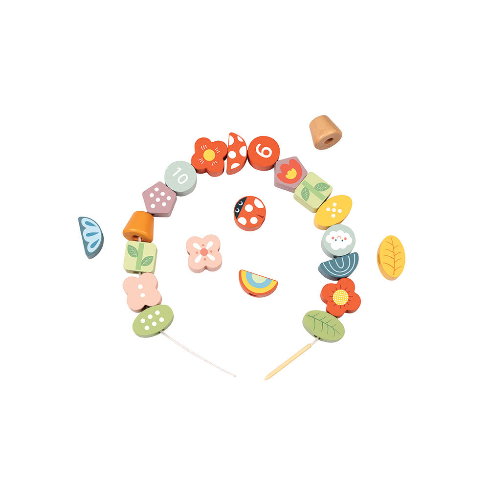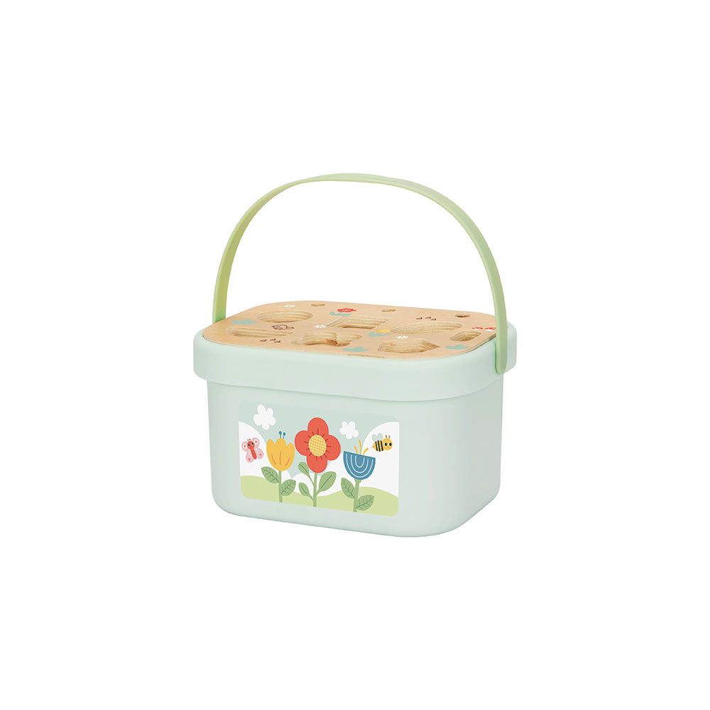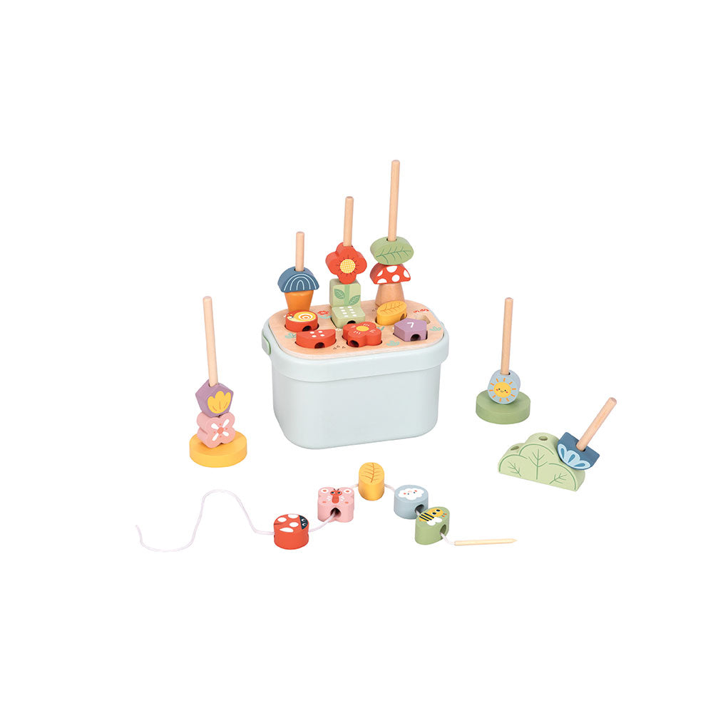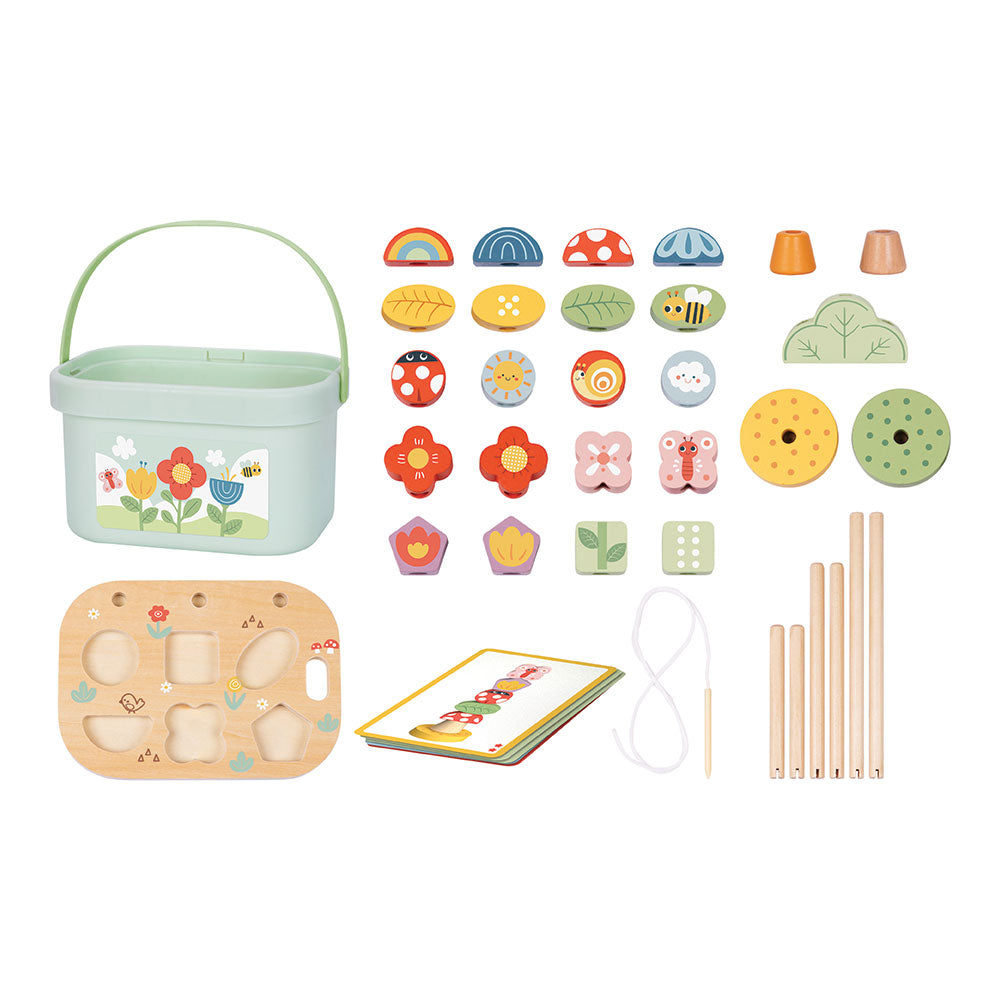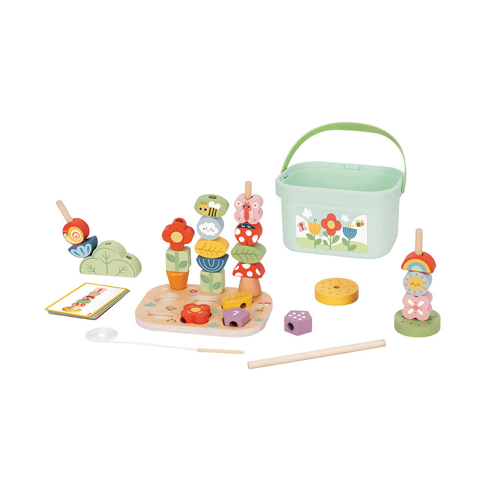 Cestinha criativa de madeira 34 peças. São muitos acessórios com motivos coloridos de jardim para poderes brincar em conjunto com outra criança. Brincar em conjunto estimula a concentração, potenciando vivências reais de amizade e de ligação emocional a momentos imaginados, sem recurso a meios digitais.