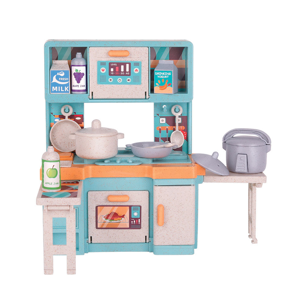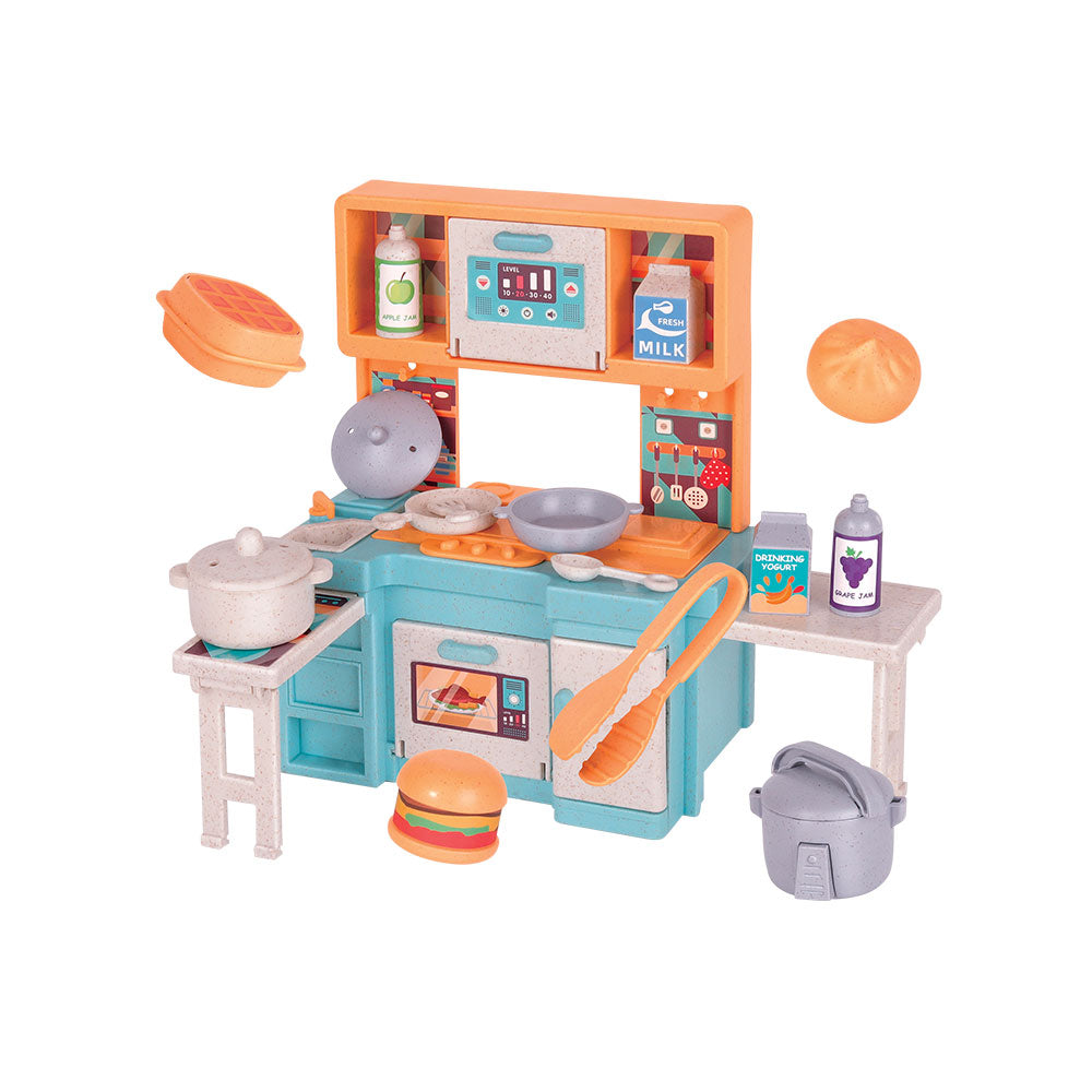 Brinquedo divertido composto por um conjunto diversificado de peças que permitem à criança uma interação lúdica com a tarefa de imitação de uma cena de cozinha.
