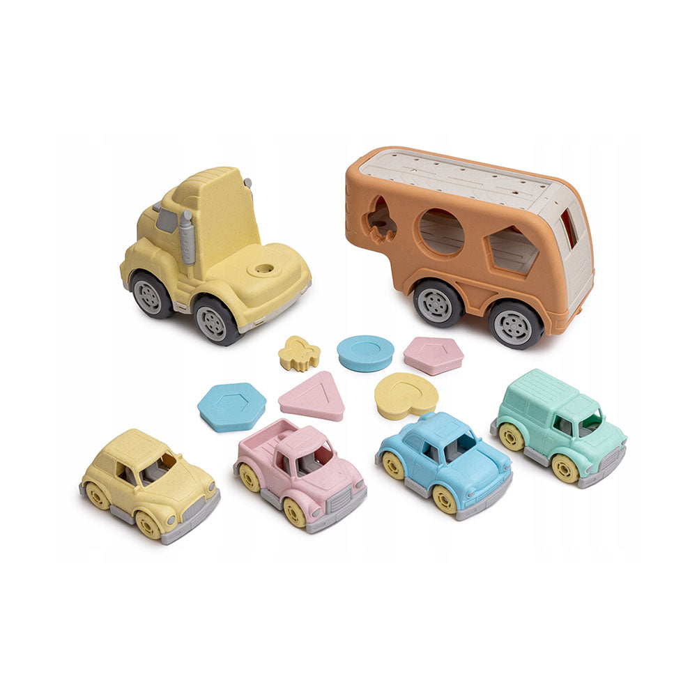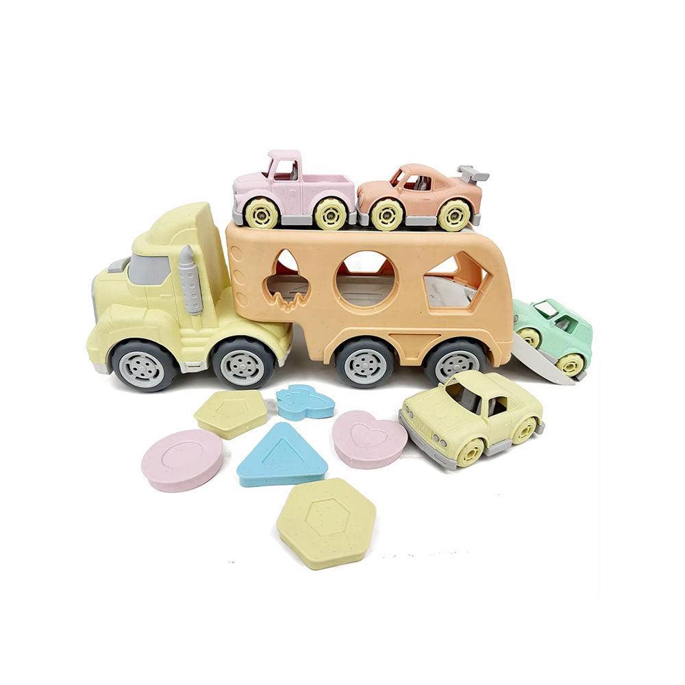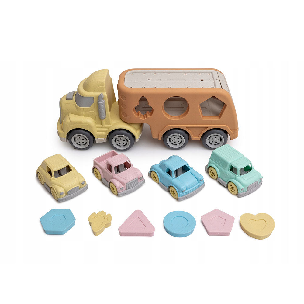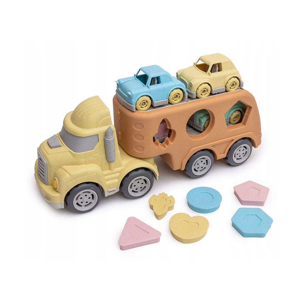 Veículo de transporte alusivo ao universo de construção civil com cores apelativas ao mundo dos brinquedos verdadeiramente ecológicos e sustentáveis. Inclui Camião e 4 carrinhos transportáveis.