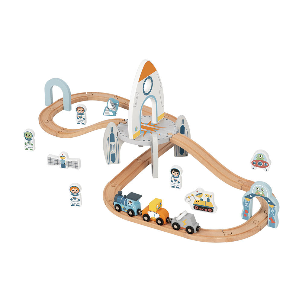 Pista de comboio de madeira Estação Espacial com 35 peças. Comboio, pista e acessórios para poderes brincar em conjunto com outra criança. Brincar em conjunto estimula a concentração, potenciando vivências reais de amizade e de ligação emocional a momentos imaginados, sem recurso a meios digitais.