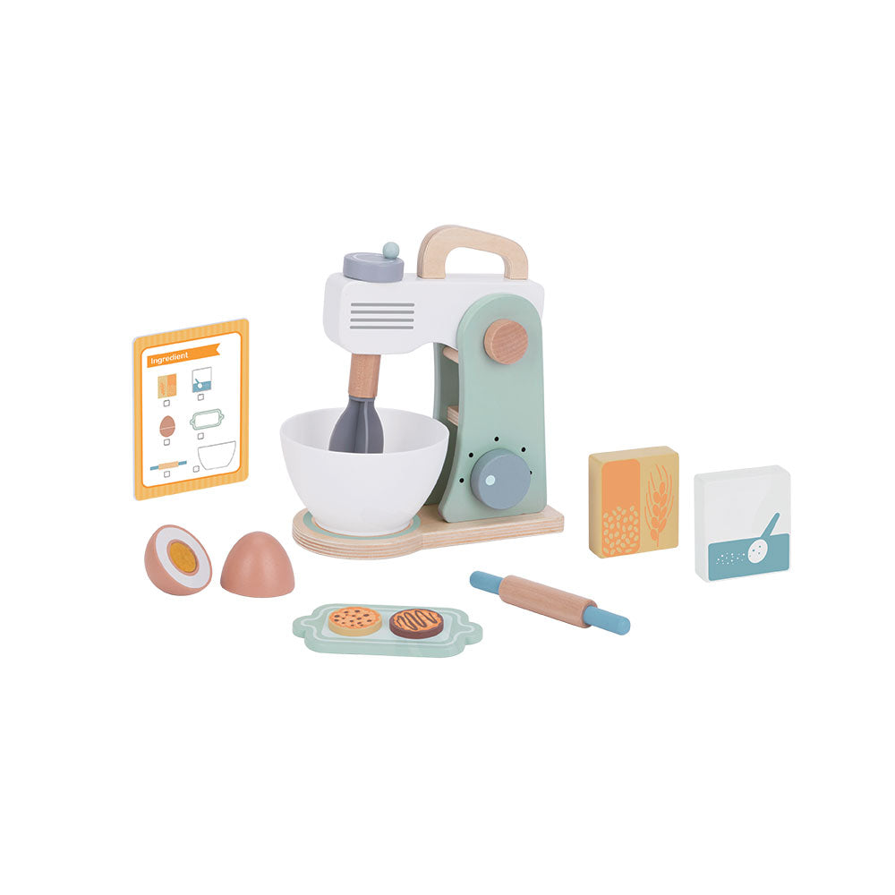 Set Batedeira 11 peças em madeira, com muitos acessórios para poderes brincar em conjunto com outra criança. Brincar em conjunto estimula a concentração, potenciando vivências reais de amizade e de ligação emocional a momentos imaginados, sem recurso a meios digitais.