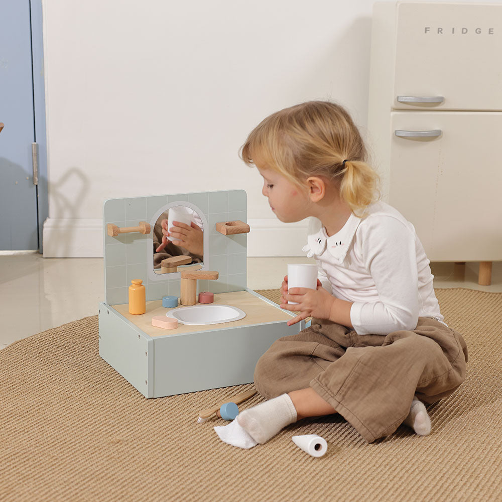 Conjunto Toillete 15 peças em madeira, com lavatório, espelho e acessórios de higiene e beleza. Brincar em conjunto estimula a concentração, potenciando vivências reais de amizade e de ligação emocional a momentos imaginados, sem recurso a meios digitais.